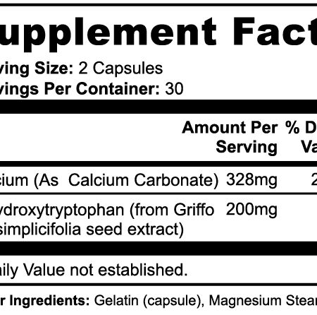 Ingredients: Calcium (as Calcium Carbonate), 5-Hydroxytryptophan (from Griffo via simplicifolia seed extract), Gelatin (capsule), Magnesium Stearate.