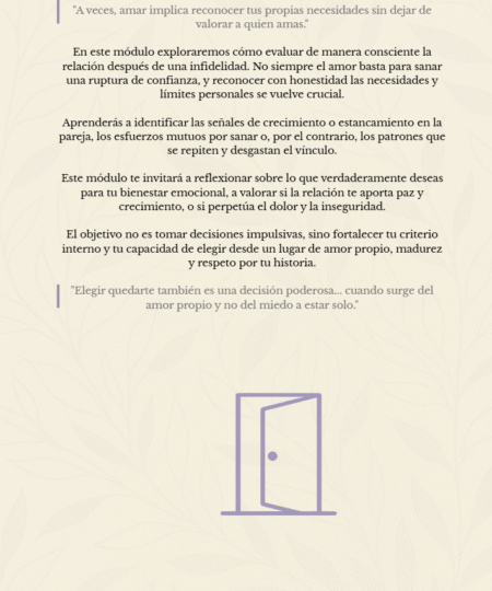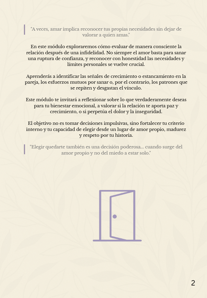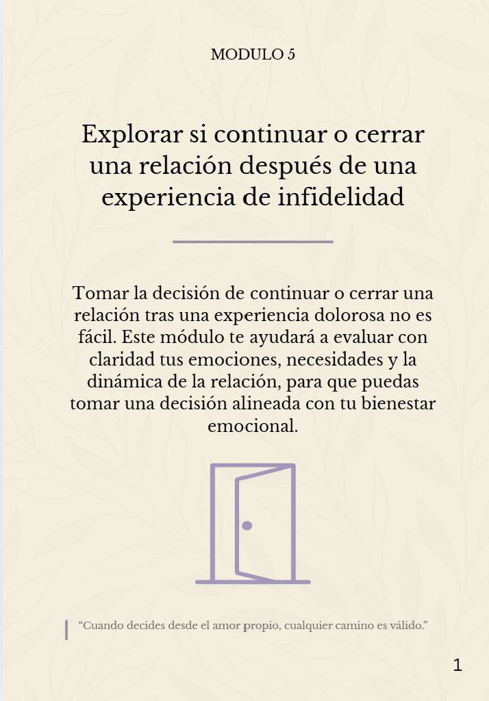 Toma una decisión desde la claridad y el amor propio. Este módulo te acompaña con reflexiones prácticas para evaluar si vale la pena continuar la relación tras una infidelidad.